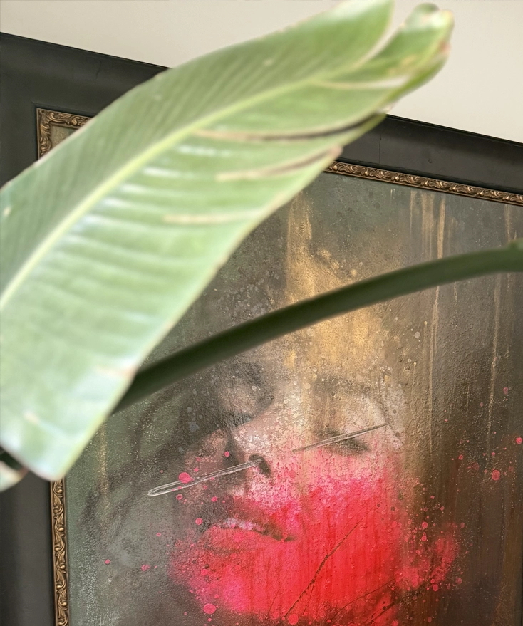 She wears the memory of childhood like a sudden blush — the red across her face recalling a scraped joy, a nose bloodied not by sorrow but by play. The needle, a slender echo of daring, pierces through the calm as if to remind her how it felt to leap without thought, to splash through puddles and taste rain on her tongue. In that fleeting rebellion, she becomes both girl and grown, standing in the tender space where wonder survives its return.